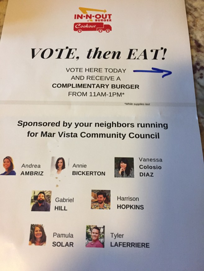 After In-N-Out withdrew due to the contractual violations and outright deceit, the Makes Waves folks scrambled to save face. When the polls opened Sunday morning at the Mar Vista Recreation Center two taco trucks appeared on the far side of the park. Makes Waves candidates and volunteers gamely pointed voters in the general direction of the decidedly sub-par substitutes.