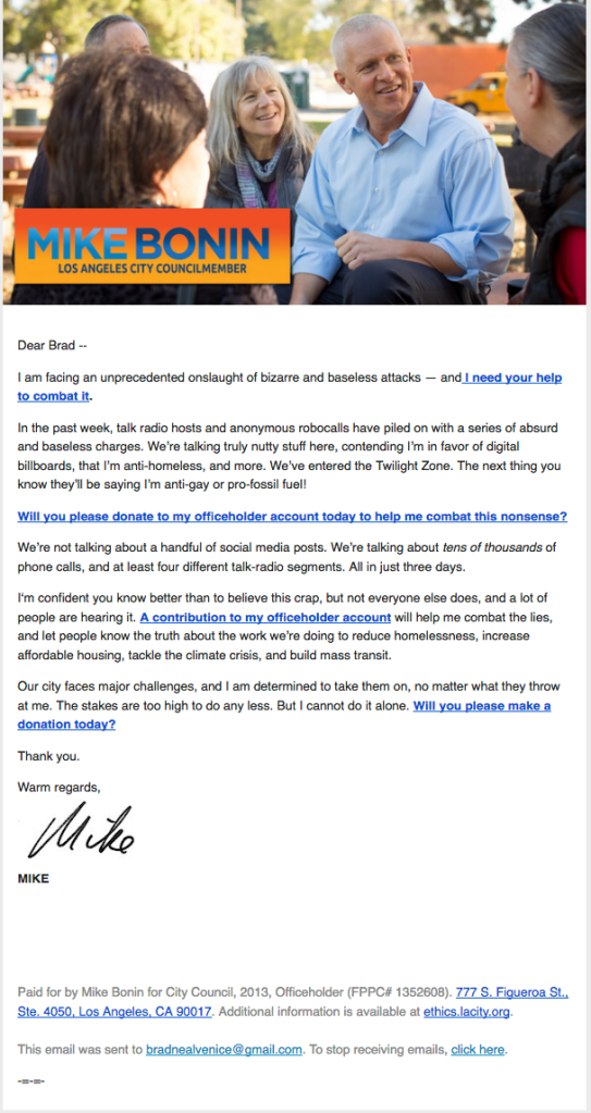 This morning’s email continues Mr. Bonin’s desperate efforts spin his way out of the inescapable facts captured in the videos, and the undeniable realities on the streets of his district. Using his own failures to try and raise money with a self-pitying email is Mr. Bonin’s ultimate act of chutzpah. He pleads for donations to help him fight reality – or rather, what he calls “an unprecedented onslaught of bizarre and baseless attacks.” Apparently three different videos capturing the same shameful scene, an elected official abandoning one of the most vulnerable members of society while that person endangers himself and his community, constitutes a “bizarre and baseless attack.”