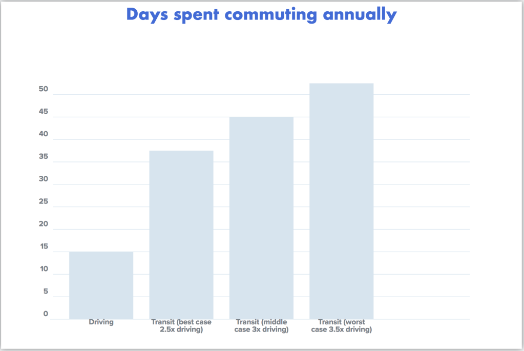 The UCLA/SCAG report makes clear that access to a private vehicle opens up opportunities that are not available to transit users. Again, this is particularly true of lower income people who don’t have the luxury of doubling or tripling their commute times. The Mexican immigrant landscaper cannot haul hundreds of pounds of equipment on the bus. The domestic worker cannot haul supplies on a train. At the same time, the increased traffic and congestion steal precious hours from those who are paid that way.