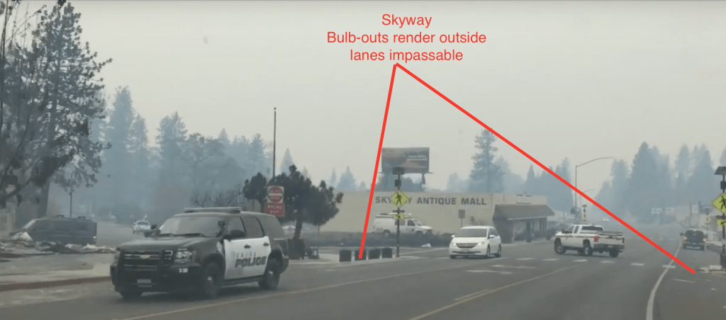 Inexplicably, in September 2009, the Butte County Board of Supervisors called the grand jury report “not reasonable.” A couple years later the county actually narrowed dozens of miles of roads throughout Paradise. Without a hint of irony officials named the initiative “Livable Streets.” The three major evacuation routes, Skyway Boulevard, Clark Road, and Pearson Street, all were narrowed in places. The county also installed center medians, sidewalk bulb-out’s, bollards, and other traffic obstacles throughout the city, supposedly in an effort to make the streets more inviting for bicyclists and pedestrians.