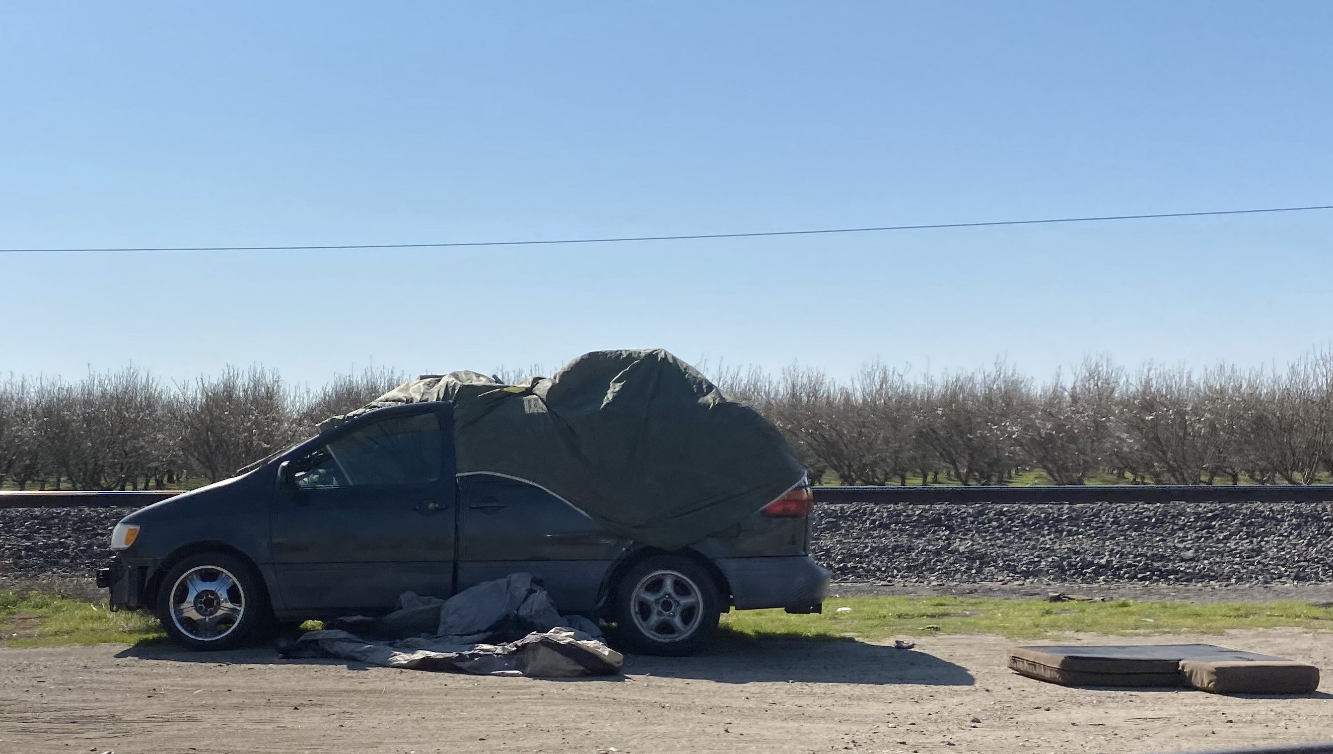 I stopped for a fill-up and road snacks on the outskirts of the agricultural town of Turlock. Behind the gas station convenience store was a neighborhood of decaying single family homes whose backyards were occupied by campers, trailers, and RVs. I wandered over to the fence and sure enough families were living in them. Children played in the mud amidst decomposing garbage. The scene was reminiscent of a refugee camp in a war-torn country, or a survivalist camp after an extinction-level event, which made its entirely quotidian aspect all the more horrifying. It’s how millions of people eke out their lives in the Golden State these days.