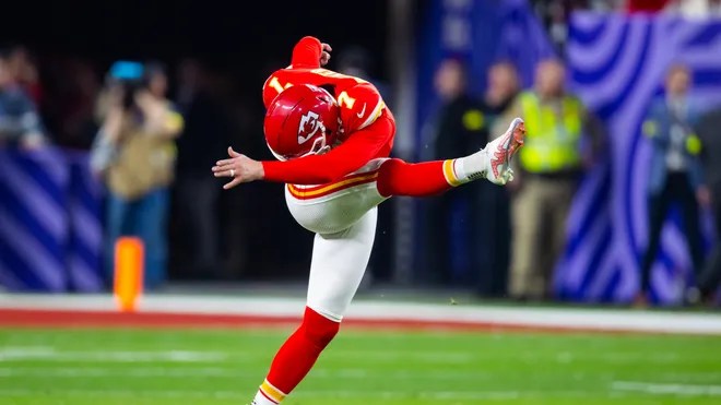 Kansas City Chiefs kicker Harrison Butker seen, appropriately, attempting to stick his head up his own posterior. Photo courtesy USA Today