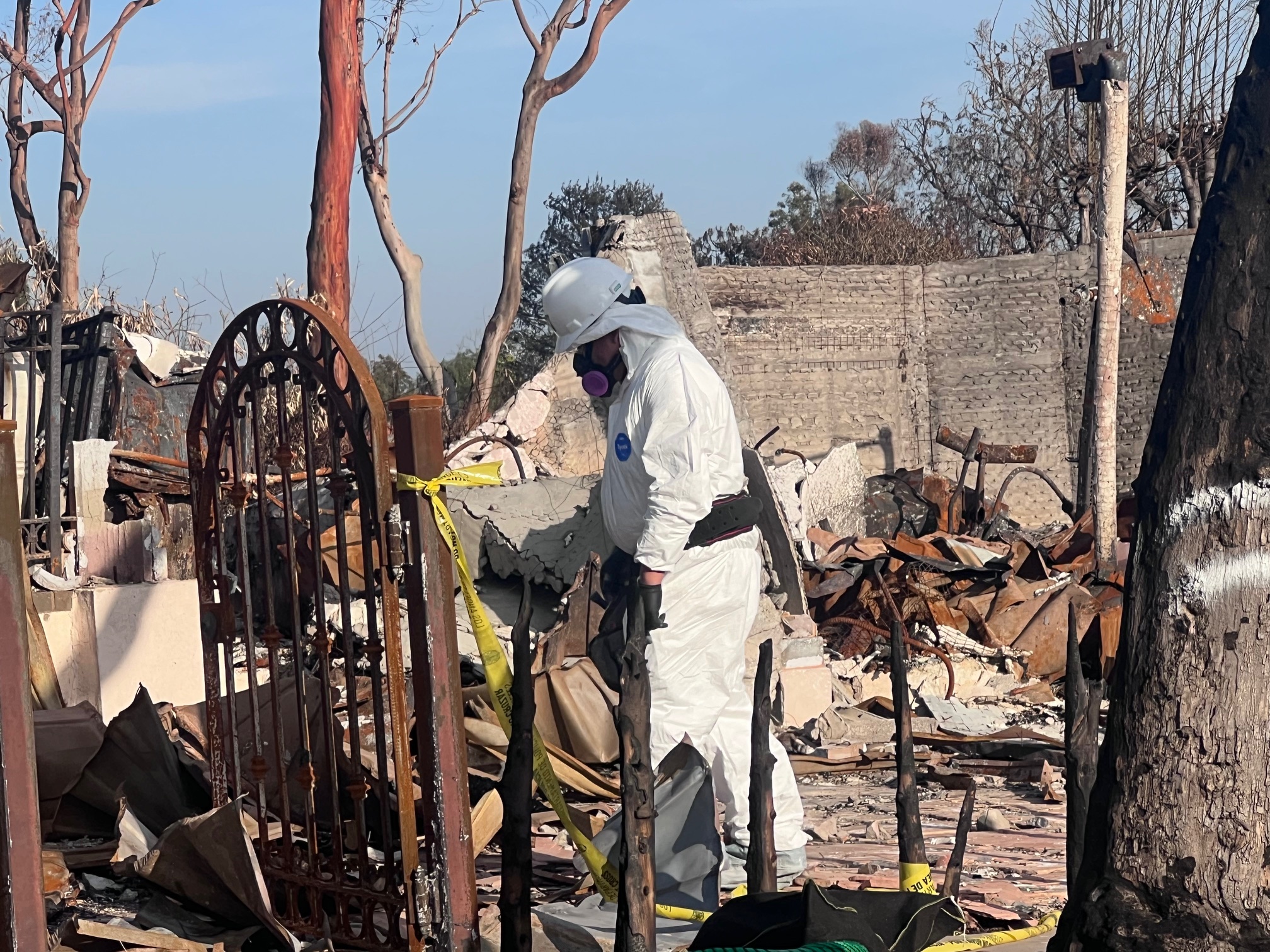 Cleanup workers in Pacific Palisades clad in HAZMAT suits and respirators because, of course, there’s nothing to worry about. Photos by Christopher LeGras