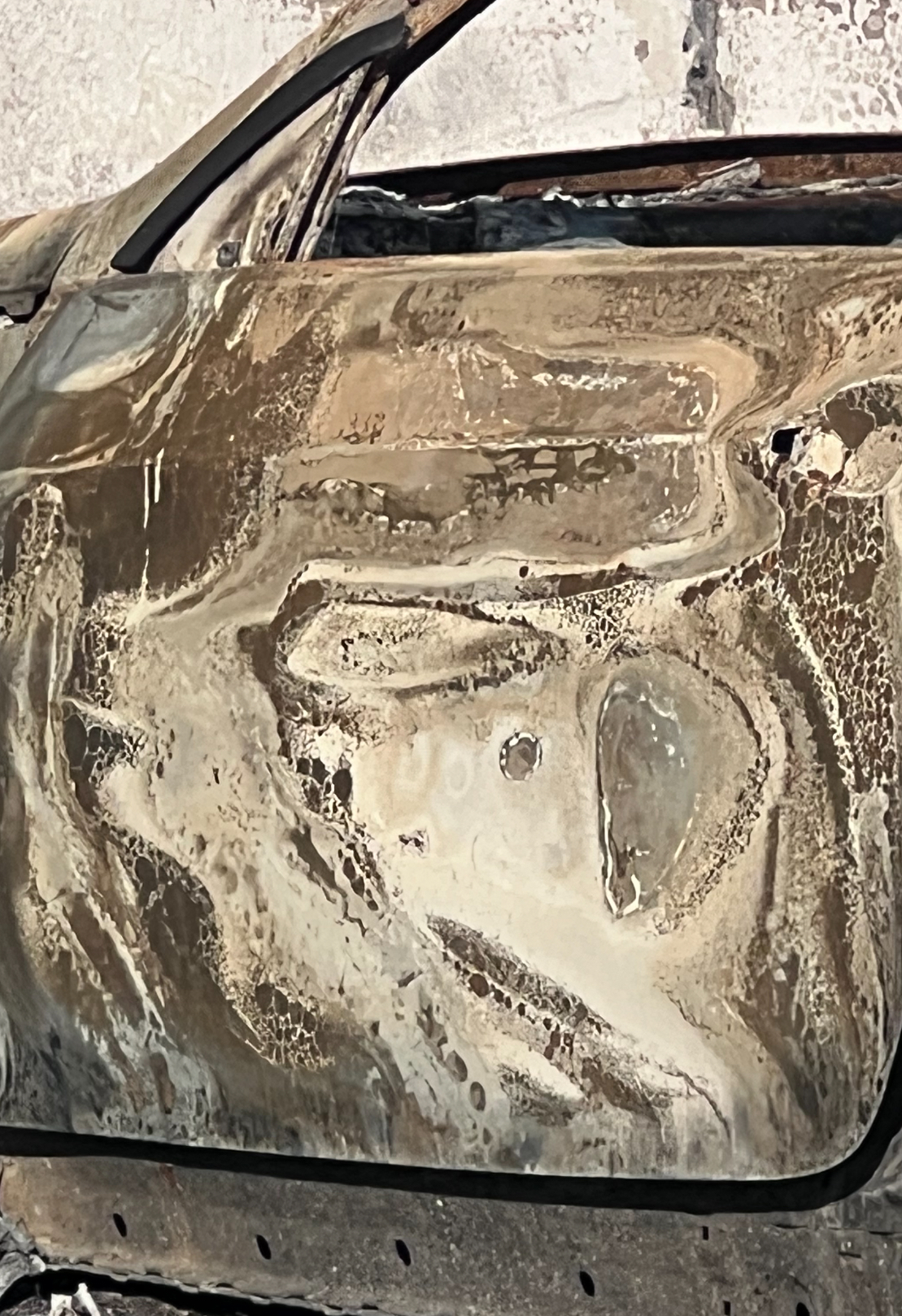 On the door of a burned car in the Palisades, paint melted in a pattern evocative of Edward Munch’s The Scream. Photo by Christopher LeGras.