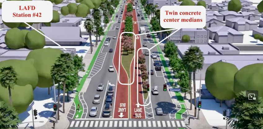 Your eyes donāt deceive you: The plan, which it cannot be emphasized enough was approved unanimously by Metroās board, features twin landscaped concrete medians, complete with trees, directly in front of Los Angeles Fire Department Station 42, completely cutting off the stationās vehicles from turning northbound on Colorado. Thereās also a conventional bus stop at the south curb of the stationās driveway (it’s the white shaded rectangle in the left of the image). Imagine a red light at rush hour, with a BRT bus in the middle lane, traffic backed up for ten blocks in the car lane, and a conventional bus at the outside lane stop. Station 42 gets a call, but the firefighters and paramedics and EMTs and techs are literally stuck in their driveway, waiting for the congestion to clear.
