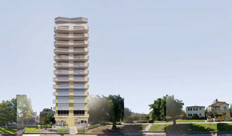 This was a real proposal, 18 stories with a total of 200 studio, one-bedroom, and two-bedroom units, in a low density single family and small multifamily neighborhood, with less than one parking spot per unit. Downloaded from Santa Monica Planning Department.