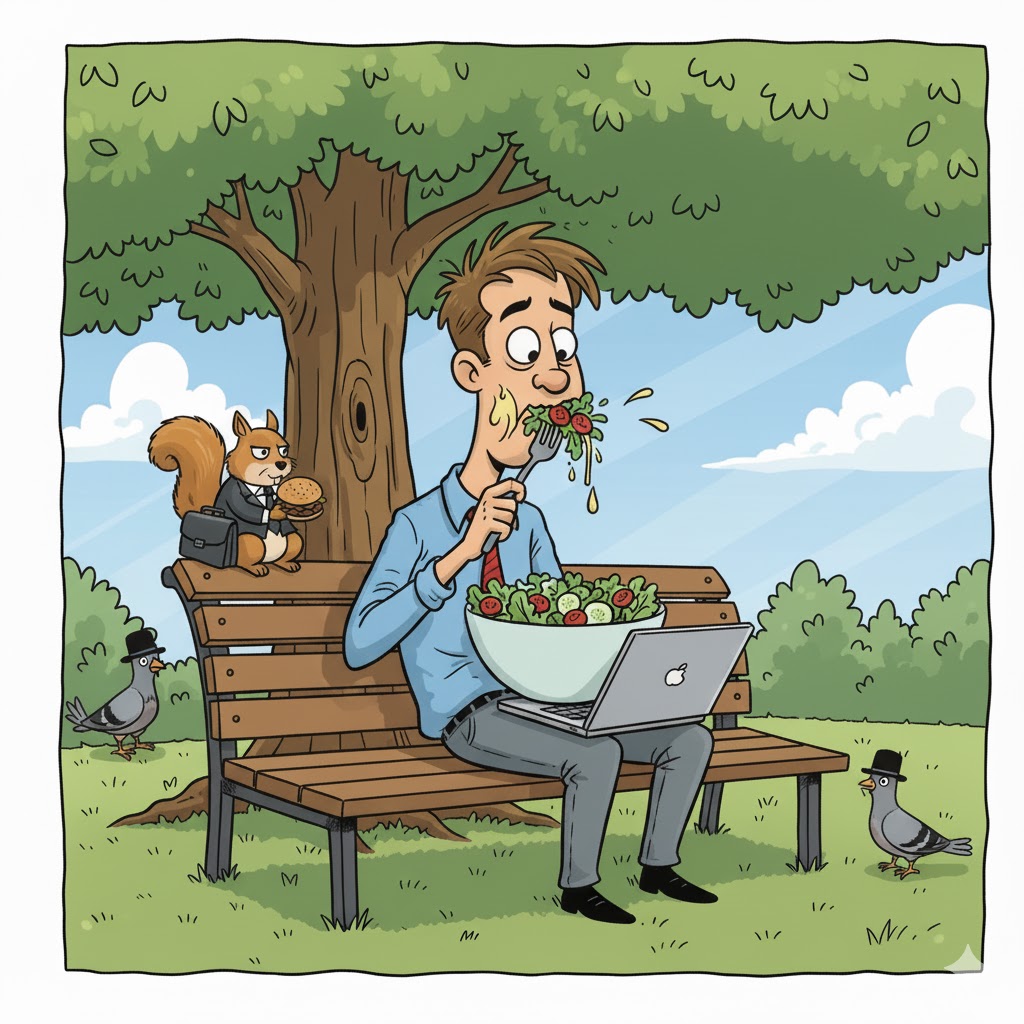 I asked Google Gemini to create a picture of a young man eating a salad in a park. The angry business squirrel with the hamburger and the top hat sporting pigeons were Gemini’s ideas. Make of that what you will. Also, hat tip to the mighty Dave Barry, whose column about this subject is far funnier than anything I could ever come up with.