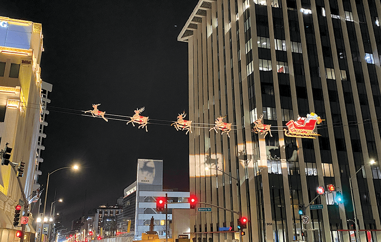 Of all the changes, the most dramatic was the virtual elimination of Christmas from public spaces. For example, Wilshire Boulevard through Beverly Hills used to be positively festooned with lights, giant snowflakes, other decorations and trees, culminating with a massive Santa’s sleigh and reindeer — complete with Rudolph leading the way — soaring over the intersection of Wilshire and Beverly Drive. Santa still makes his annual appearance these days, but the rest of the street is nearly bereft of decor, save for some white lights. Driving around much of West L.A. in December these days, you’d be forgiven if you forgot Christmas was coming at all.