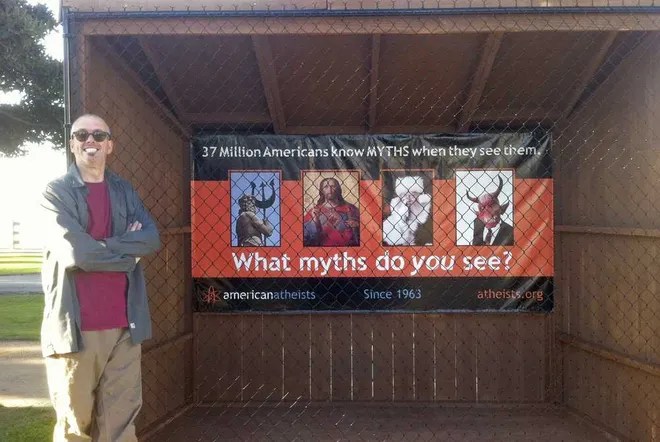 The first year an atheist obtained permits for sites that had traditionally been used for the nativity scenes, he put up a chain link fence and hung a sign declaring, “Religions are all alike, founded upon fables and mythologies.” This quote has long been spuriously attributed to Thomas Jefferson, who never uttered it (in its decision upholding the city’s termination of the nativity tradition the Ninth Circuit Court of Appeals, with its typical depthless ignorance, attributed the quote to the Founder). Another site featured a sign with pictures of Poseidon, Jesus, Santa and Satan, with the caption “What Myths Do You See?”