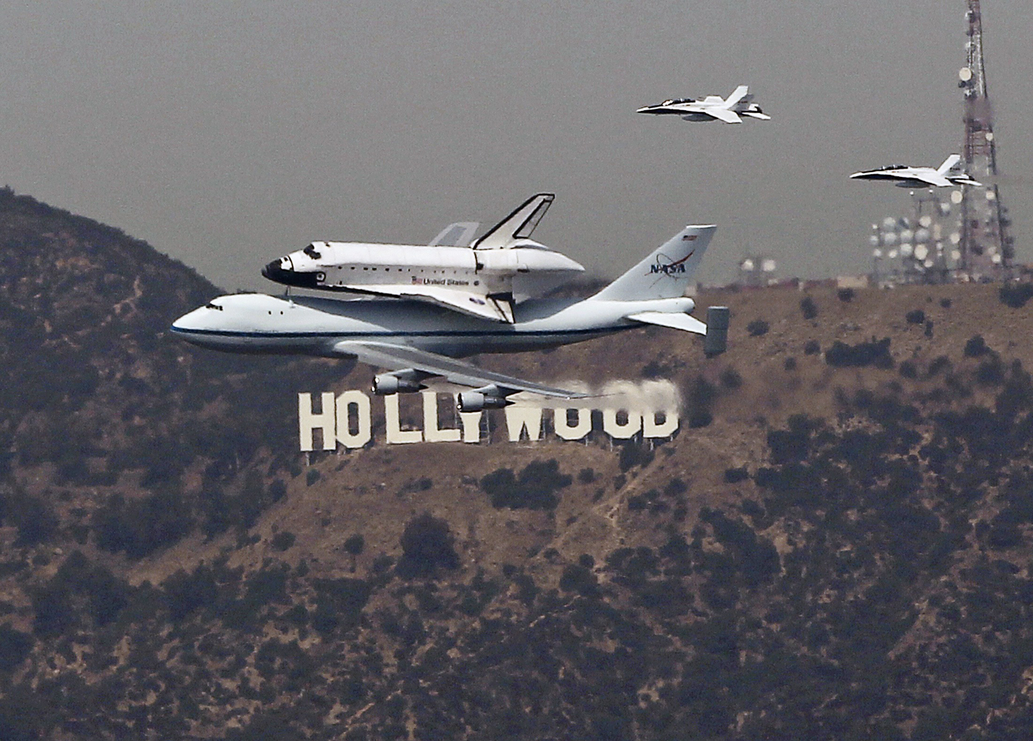 I also thought of a more recent memory, when the Space Shuttle Endeavor arrived above L.A. attached to its Boeing 747 transport, flanked by F/A-18 fighter jets and T-28 Talon jet trainers. I remembered how tens of thousands of people gathered along the Santa Monica bluffs for its arrival, lining the bluffs themselves, the beach, the Santa Monica Pier, rooftops, even parking garages.