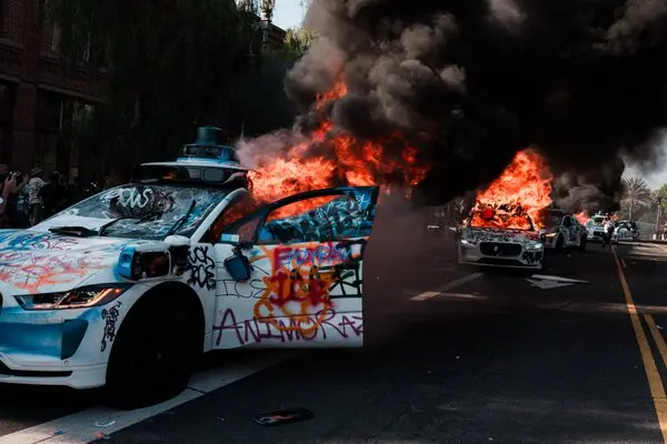 Earlier this year, rioters set three Waymos on fire in downtown Los Angeles. It is impossible to convey in words how much joy this scene brought me.