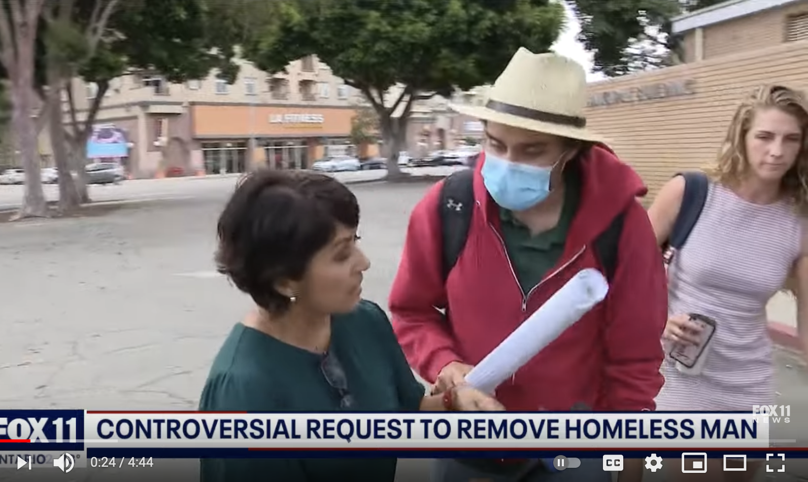 CD 11 residents have seen well how Bonin responds to homelessness. In October 2019, while homeless fires and wildfires were raging statewide, he was captured literally turning his back on a mentally disturbed homeless man in his district as the man started a fire next to a propane tank. Stills from a video by Christopher LeGras