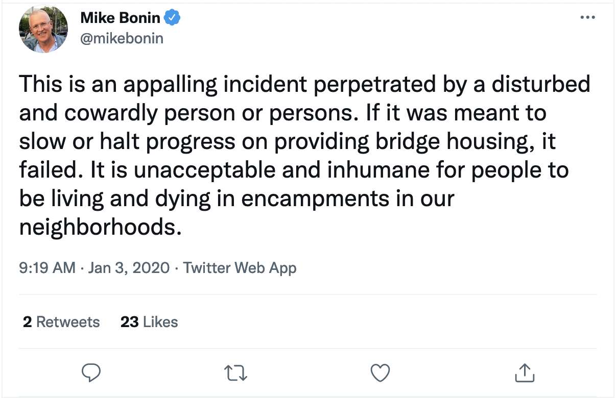 Now, at the 11th hour of his political career, he is trying to reframe the conversation. Maybe Mike Bonin really believes he can erase ten years of failure with a few Tweets. Maybe he thinks a few tree giveaways, a few treacly pictures at elder care facility will blight people’s memories, say, of the time he accused his own residents of planting an explosive device at his precious Bridge homeless shelter. Maybe he thinks lashing out at the grassroots neighbors who collected more support for the recall than he mustered in his last election is a winning strategy.