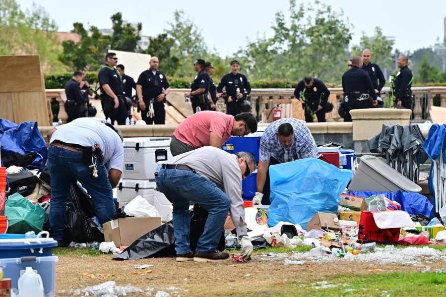 Aerial footage! Countless clashes! Unknown numbers of injuries! Last night the grown-ups finally had enough and sent in the cops to clear the encampment, which fittingly had come to resemble an illegal homeless camp filled with piles of garbage and graffiti. In the car on the way to the dog park yesterday evening nearly every radio station had reporters on campus, again reporting breathlessly. The kids “are really getting ready for anything,” said KABC with Walter Cronkite seriousness. I hadn’t realized there were so many local reporters left in this town.