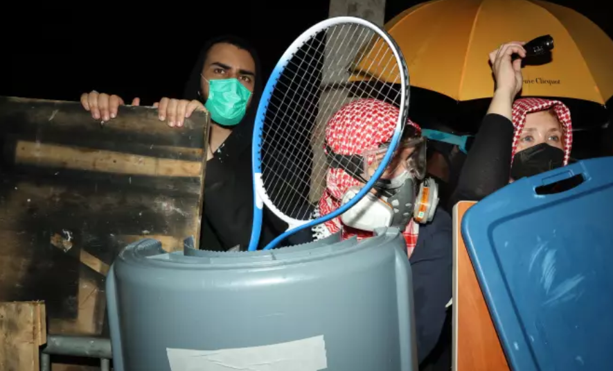 My favorite picture from all the protests is of a wild-eyed kid at UCLA wearing a red Kiffeyah (of course), ski goggles, and a gas mask, hiding behind a sawed in half plastic trash can and what appears to be a large Tupperware or Rubbermade lid, menacing police with a tennis racquet. Ironically, the tennis racquet is blue and white, the colors of the Israeli flag. The Veuve Clicquot golf umbrella in the background is a perfect touch. You cannot make this stuff up.