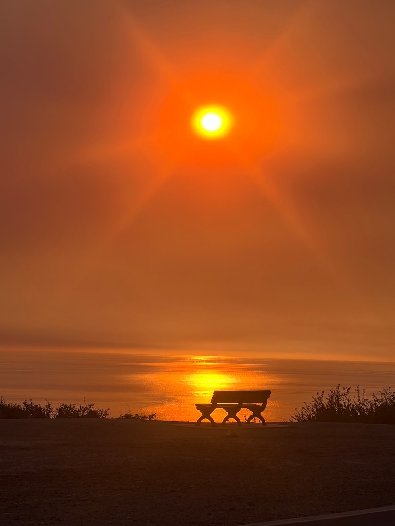 Bookends to failure: Left, an LAPD officer on patrol on Melrose Ave. in L.A.’s Fairfax District on May 30, 2020 during the George Floyd riots. Right, the sun sets through the smoke in Pacific Palisades on January 9, 2025. Photographs by Christopher LeGras.
